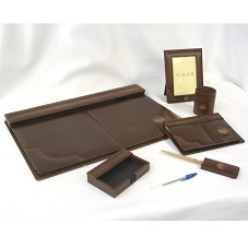 CONJUNTO PARA ESCRITÓRIO COMPOSTO POR SEIS PEÇAS: UM RISQUE E RABISQUE (38,5X57 CM) COM TAMPA EM COURO E NA PARTE SUPERIOR UM ESTOJO EM MADEIRA; UM PORTA-CANETA CILÍNDRICO (9X7,5X7,5 CM); UM ABRIDOR DE CARTA COM LÂMINA EM METAL DOURADO (2,5 CM); UM PORTA-PAPEL BILHETE (3X15X9,5 CM); UM BLOCO DE ANOTAÇÕES E UM PORTA-RETRATO (21X16 CM). TODOS REVESTIDOS EM COURO MARROM, COM DETALHES EM COSTURA E O BRASÃO DA 'REPÚBLICA DE EL SALVADOR EN LA AMERICA CENTRAL' GRAVADO.