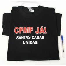 CAMISETA (TAM GG) EM MALHA PRETA, DE MANGA CURTA. NA FRENTE, ESTAMPA EM VERMELHO E BRANCO, CONTENDO A INSCRIÇÃO 'CPMF JÁ / SANTAS CASAS UNIDAS'.