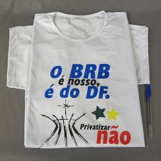 CAMISETA (TAM G) EM MALHA BRANCA, DE MANGA CURTA. NA FRENTE, ESTAMPA EM AZUL, PRETO, AMARELO , VERDE E VERMELHO, MOSTRANDO DESENHO DA CATEDRAL DE BRASÍLIA E A INSCRIÇÃO 'O BRB É NOSSO, É DO DF / PRIVATIZAR NÃO'. ATRÁS, 'SINDICATO DOS BANCÁRIO DE BRASÍLIA / CONTRAF / CUT' E LOGOMARCAS.