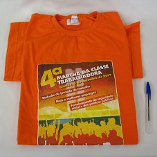 CAMISETA (TAM G) EM MALHA LARANJA, DE MANGA CURTA. NA FRENTE, ESTAMPA MOSTRANDO DESENHO DE UMA MULTIDÃO EM FRENTE AO CONGRESSO NACIONAL, E A INSCRIÇÃO '4ª MARCHA DA CLASSE TRABALHADORA / BRASÍLIA, 5 DE DEZEMBRO DE 2007 / REDUÇÃO DA JORNADA DE TRABALHO / MAIS E MELHORES EMPREGOS / FORTALECIMENTO DA SEGURIDADE SOCIAL E DAS POLÍTICAS PÚBLICAS'. ATRÁS, 'COORDENAÇÃO / FORÇA SINDICAL'.