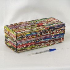 CAIXA DE PAPELÃO (10,5X28X12 CM) FORRADA INTERNAMENTE COM PAPEL AVELUDADO NA COR AZUL E, EXTERNAMENTE, COM ROLINHOS CONFECCIONADOS COM FOLHAS DE JORNAL E REVISTAS.