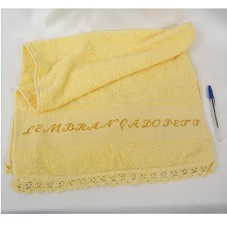 TOALHA DE ROSTO (80X45 CM) NA COR AMARELA. POSSUI BICO DE CROCHÊ E FAIXA BORDADA COM A INSCRIÇÃO 'LEMBRANÇA DO PETJ'.