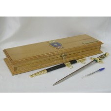 ADAGA (42,5 CM), COM LÂMINA EM METAL PRATEADO, COM DESENHOS GRAVADOS NAS DUAS FACES. POSSUI PUNHAL EM METAL DOURADO E RESINA PRETA; BAINHA PRETA COM DETALHES EM DOURADO. ACONDICIONADA EM ESTOJO DE MADEIRA (6X52,5X17 CM), FORRADO INTERNAMENTE DE VELUDO AZUL MARINHO. NA TAMPA, PLACA EM METAL DOURADO COM A INSCRIÇÃO 'AO PRESIDENTE LUIZ INÁCIO LULA DA SILVA, OFERECEM OS SENTINELAS DOS MARES , POR OCASIÃO DE SUA VISITA À ESCOLA NAVAL. ILHA DE VILLEGAGNON, 08 DE DEZEMBRO DE 2007', E BRASÃO DA ESCOLA.