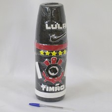 PORTA-GARRAFA (32,5 CM) EM ISOPOR, NA COR PRETA. NA FRENTE, EM EVA NAS CORES BRANCO, VERMELHO, AMARELO E PRETO, O BRASÃO DO CORINTHIANS E A INSCRIÇÃO 'LULA / TIMÃO'.