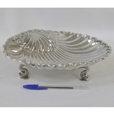 PETISQUEIRA OU FRUTEIRA (6,5X26X26 CM), CONFECCIONADA EM PRATA 925, NO FORMATO DE UMA CONCHA, ASSENTADA SOBRE TRÊS PÉS REPRESENTANDO GOLFINHOS, NUMA REFERÊNCIA ALEGÓRICA À ÁGUA. ORIGINALMENTE USADA COMO PIA BATISMAL, DAÍ SEU NOME. ACONDICIONADA EM CAIXA FORRADA DE NAPA PRETA.