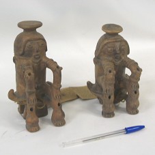 DUAS URNAS CONFECCIONADAS EM ARGILA, A PARTIR DAS REFERÊNCIAS ICONOGRÁFICAS DA CIVILIZAÇÃO MARACÁ. A PRIMEIRA (17 CM) REPRESENTANDO UMA FIGURA MASCULINA SENTADA SOBRE UM BANCO. A SEGUNDA (14,5 CM), REPRESENTAÇÃO FEMININA, EM MESMA POSIÇÃO. ACOMPANHAM ETIQUETAS COM DESCRIÇÃO DA PEÇA. ACONDICIONADAS EM CAIXA FORRADA DE PAPEL MARROM E BEGE.