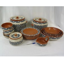 CONJUNTO DE FEIJOADA, CONFECCIONADO EM ARGILA, NA COR MARROM COM BEGE, COM DETALHES EM CINZA E DESENHOS GEOMÉTRICOS. COMPOSTO POR: DOZE PRATOS RASOS; DOZE TIGELAS / BOWLS PEQUENAS; UM MOLHEIRO; UM PORTA-FARINHA COM TAMPA E COLHER DE MADEIRA; DUAS PANELAS GRANDES COM TAMPA; E QUATRO TRAVESSAS FUNDAS DE TAMANHOS DIFERENTES. ACONDICIONADO EM CAIXA DE PAPELÃO REFORÇADA COM MADEIRA. NA CAIXA, NOME E TELEFONE DO FABRICANTE 'DOCA LEITE ARTESANATO DO PARÁ'.