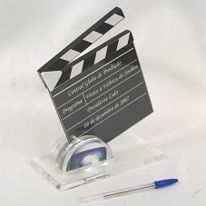 PLACA EM ACRÍLICO (22X17X4,5 CM), NO FORMATO DE UM CLAQUETE, CONTENDO A INSCRIÇÃO 'CENTRAL GLOBO DE PRODUÇÃO / PROGRAMA / VISITA À FÁBRICA DE SONHOS / PRESIDENTE LULA / 08 DE DEZEMBRO DE 2007'. FIXADA EM BASE DE MESMO MATERIAL, ONDE HÁ SÍMBOLO DA REDE GLOBO. NA PARTE POSTERIOR, DESENHO DOS ESTÚDIOS DA REDE GLOBO.