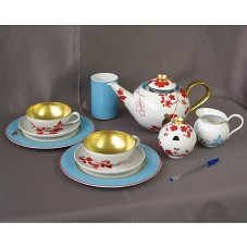 CONJUNTO PARA CHÁ, EM PORCELANA BRANCA, COM PINTURA VERMELHA DE MOTIVOS FLORAIS, DETALHES EM DOURADO E AZUL. COMPOSTO POR: DUAS XÍCARAS PINTADAS INTERNAMENTE DE DOURADO, ACOMPANHADAS DE PIRES; DOIS PRATOS DE SOBREMESA, COM BORDAS EM AZUL E LISTRAS DOURADA E VERMELHA; UM BULE COM FILTRO METÁLICO E TAMPA EM PORCELANA; UM SUPORTE PARA O FILTRO, EM PORCELANA AZUL; UM AÇUCAREIRO COM TAMPA; UMA JARRA PEQUENA PARA LEITE. ACONDICIONADO EM CAIXA DE PAPELÃO BRANCO, COM NOME E LOGOMARCA DO FABRICANTE NA TAMPA. ACOMPANHA CARTÃO DE APRESENTAÇÃO EM NOME DE 'EVA LUISE KOHLER', 'DER PRESIDENT DER BUNDESREPUBLIK DEUTSCHLAND'.