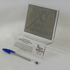 PLACA (9X12 CM) EM METAL PRATEADO, POSSUINDO A INSCRIÇÃO '40 ANOS DE PAIXÃO', COM O NÚMERO '40' FORMANDO UMA CRUZ. FIXADA EM BASE ACRÍLICA, ONDE HÁ A INSCRIÇÃO 'EXCELENTÍSSIMA SENHORA MARISA LETÍCIA LULA DA SILVA / PRESIDENTE DA REPÚBLICA / A SOCIEDADE TEATRAL DA FAZENDA NOVA TEM A HONRA DE HOMENAGEÁ-LO NESTE MOMENTO TÃO SIGNIFICATIVO EM QUE COMEMORAMOS OS 40 ANOS DA PAIXÃO DE CRISTO EM NOVA JERUSALÉM, EM RECONHECIMENTO AO APOIO RECEBIDO TODOS ESTES ANOS. A COMENDA SERVIRÁ, AINDA, COMO INCENTIVO AS GERAÇÕES FUTURAS PARA A PRESERVAÇÃO E ENGRANDECIMENTO DA CULTURA DE PERNAMBUCO E DO BRASIL / PAIXÃO DE CRISTO / NOVA JERUSALÉM - PERNAMBUCO / 1968 - 2007'.