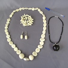 CONJUNTO DE BIOJÓIAS, CONFECCIONADO COM SEMENTE DE JARINA E DETALHES EM PRATA, COMPOSTO POR UM PAR DE BRINCOS, UMA PULSEIRA E UM COLAR. ACOMPANHA OUTRO COLAR EM SEMENTE DE TUCUMÃ E DETALHES EM PRATA. CADA PEÇA ACONDICIONADA SEPARADAMENTE EM ESTOJOS DE PAPELÃO COM NOME DA MARCA NA TAMPA; E ESTES, EM ESTOJO MAIOR COM A INSCRIÇÃO 'GALUART BELEZA EM DETALHES' NA TAMPA. ACOMPANHA FOLDERS E CARTÃO DE VISITA DA EMPRESA, EM NOME DE 'ELENISE BANDEIRA DE MELLO BARROS', COM TELEFONES.