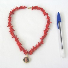 COLAR EM CONTAS VERMELHAS, DE FORMATOS VARIADOS, TENDO COMO PINGENTE RELICÁRIO QUE POSSUI, NO ANVERSO, FOTOGRAFIA DA PRIMEIRA-DAMA MARISA; NO REVERSO, DESENHO ESTILIZADO DA MESMA. ACONDICIONADO EM ESTOJO FORRADO DE VELUDO PRETO.