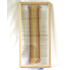QUADRO (65,5X31,5 CM) COM MOLDURA EM MADEIRA CLARA E TAMPO DE VIDRO. EMOLDURA FAIXA (59X10,5 CM) EM TAPEÇARIA, EM TONS DE MARROM, TRANÇADA ENTRE FILETES DE BAMBUZINHO. VIDRO FIXADO COM SILICONE.