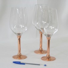 CONJUNTO DE SEIS TAÇAS DE CRISTAL COM PÉS EM COBRE. ACONDICIONADOS EM ESTOJO FORRADO DE LYCRA AZUL MARINHO.