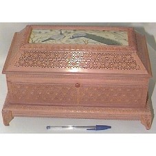 CAIXA DE MADEIRA EM FORMA DE ARCA (33,5X18,5X19 CM). TRABALHADA MANUALMENTE, COM DESENHOS ENTALHADOS DE: FLORES E FOLHAS (AO LONGO DELA), E ELEFANTES (NOS PÉS DA ARCA). TAMPA COM PINTURA DE DOIS PAVÕES EM UM JARDIM, COBERTA POR VIDRO E EMOLDURADA PELA PRÓPRIA MADEIRA. ACONDICIONADA EM CAIXA DE MADEIRA (22,5X38X25 CM) COBERTA POR PAPEL AVELUDADO NA COR VERMELHA. ACOMPANHA CARTÃO COM OS DIZERES: 'WITH COMPLIMENTS FROM THE MINISTER OF EXTERNAL AFFAIRS NEW DELHI INDIA'.