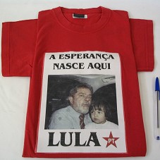 CAMISETA (TAM G) EM MALHA, NA COR VERMELHA, COM FOTO DO PRESIDENTE LUIZ INÁCIO LULA DA SILVA SEGURANDO UMA CRIANÇA NO COLO, EM ESTAMPA BRANCA EMBORRACHADA, COM OS DIZERES 'A ESPERANÇA NASCE AQUI / LULA PT'.