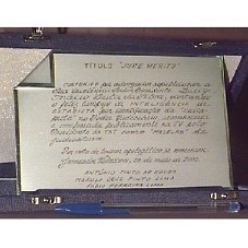 PLACA (12X18 CM) EM MATERIAL PRATEADO FOSCO, COM BORDAS EM PRATA POLIDO, E UMA DELAS DOBRADA. CONTÉM OS DIZERES 'TÍTULO 'JURE MERITO' CONFERIDO POR ADVOGADOS REPUBLICANOS A SUA EXCELÊNCIA SENHOR PRESIDENTE LUIZ INÁCIO LULA DA SILVA, EXORTANDO O FELIZ LAMPEJO DE INTELIGÊNCIA DE ESTADISTA POR IDENTIFICAÇÃO DA 'CAIXA-PRETA' O PODER JUDICIÁRIO, RECONHECIDA E CONFESSADA PUBLICAMENTE NA TV PELO PRESIDENTE DO TST COMO 'MAZELAS' DA JUDICIATURA. POR VOTO DE LOUVOR APOLOGÉTICO SE NOMEIAM. GOVERNADOR VALADARES, 28 DE MAIO DE 2003. ANTÔNIO PINTO DE SOUZA MARUZA CRUZ PINTO LIMA FÁBIO FERREIRA LIMA'. ACONDICIONADA EM CAIXA (23,5X17X2,5 CM) DE MADEIRA, FORRADA POR TECIDO EM LYCRA AZUL MARINHO. ACOMPANHA ENVELOPE CONTENDO O TÍTULO ASSINADO.