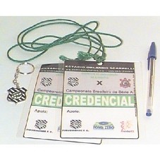DUAS CREDENCIAS PARA O JOGO 'FIGUEIRENSE F. C. X S.C. CORÍNTHIANS', REALIZADO EM 06/04/03 NO ESTÁDIO ORLANDO SCARPELLI, FLORIANÓPOLIS - SC. E UM CHAVEIRO DO TIME FIGUEIRENSE.