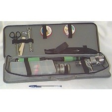 ESTOJO (52X20X7 CM) NA COR CINZA, EM MATERIAL EMBORRACHADO, COM ALÇA, CONTENDO MATERIAL DE PESCA. NA PARTE SUPERIOR DO ESTOJO, O LOGOTIPO DA ECOMAR, COM OS DIZERES 'ECOMAR INDÚSTRIA DE PESCA S/A'. ACONDICIONADO EM CAIXA DE PAPELÃO (53X20S7,5 CM) MARROM MESCLADO.
