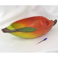 GAMELA (11,5X56X25,5 CM) CONFECCIONADA EM ARGILA, NO FORMATO DE UM CAJU. PINTADA EM TONS DE VERMELHO, AMARELO, VERDE E MARROM. EM UMA DAS LATERAIS, ASSINATURA DA ARTISTA 'SUZANA SÁ'.