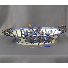 TRAVESSA/GAMELA (8,5X49X29,5 CM) EM PORCELANA BEGE, COM PINTURA EM TONS DE AZUL, LARANJA PRETO E MARROM, DE MOTIVOS FLORAIS E DESENHOS DE ZEBRAS. POSSUI BORDA ONDULADA, E, EM ALTO RELEVO, FLORES E ZEBRAS. NO FUNDO DA BASE, A INSCRIÇÃO 'MADE BY BEAUTY / P.T.A. BY PUNCH / ARAMORE STUDIO'. ACOMPANHA CARTÃO EM NOME DO AGENTE. ACONDICIONADA EM CAIXA FORRADA DE NAPA AZUL MARINHO, COM BRASÃO DA REPÚBLICA DA ÁFRICA DO SUL NA TAMPA.