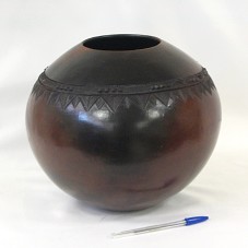 VASO EM CERÂMICA (25X26X26 CM), NA COR MARROM, COM ALGUMAS PARTES EM TONALIDADE MAIS ESCURA, COMO QUEIMADO. POSSUI BOJO ABAULADO E DESENHO DE FORMATO GEOMÉTRICO, GRAVADO NA PEÇA, PRÓXIMO À ABERTURA SUPERIOR. NO FUNDO, GRAVAÇÃO COM NOME DO ARTISTA 'NESTA-NAIA 21-05-2004'. ACONDICIONADO EM CAIXA FORRADA DE NAPA AZUL MARINHO, COM BRASÃO DA ÁFRICA DO SUL NA TAMPA. ACOMPANHA CARTÃO DO AGENTE.