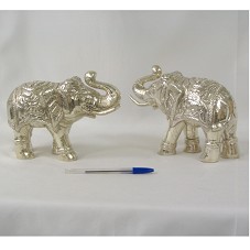 DUAS ESCULTURAS (15X22X8,5 CM) EM RESINA FOLHEADA EM PRATA, REPRESENTANDO UM PAR DE ELEFANTES ORNADOS COM TECIDOS. ACONDICIONADAS EM ESTOJO FORRADA DE VELUDO AZUL MARINHO.