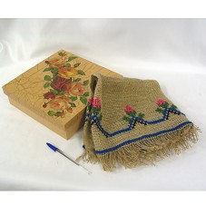 TOALHA DE MESA (42X100,5 CM) CONFECCIONADA EM JUTA, COM BORDADO DE MOTIVOS FLORAIS. POSSUI AS LATERAIS MAIORES EM FRANJAS. ACONDICIONADA EM CAIXA DE MADEIRA (6,5X24X24 CM), PINTADA DE BEGE, COM TAMPA EM MOTIVOS FLORAIS E CRAQUELÊ.