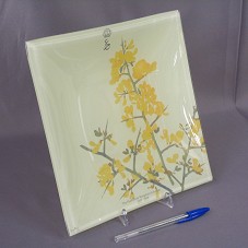 PRATO DECORATIVO (24,5X24,5 CM), DE FORMATO QUADRANGULAR, NA COR AMARELADA. POSSUI PINTURA COM RAMOS DE FLORES AMARELAS. NA PARTE SUPERIOR, COROA E SÍMBOLO DO REINO. NA INFERIOR, 'THE HASHEMITE KINGDOM OF JORDAN / 2007-2008'. ACOMPANHA SUPORTE DE MESA EM ACRÍLICO TRANSPARENTE.
