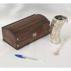 CUIA E BOMBA PARA CHIMARRÃO. CUIA (14 CM) DE FORMATO CILÍNDRICO CURVO, SENDO O INTERIOR PARTE DE UM CHIFRE, REVESTIDO EXTERNAMENTE EM PRATA TRABALHADA COM MOTIVOS FLORAIS E DE ARABESCOS, TENDO EM UMA DAS LATERAIS A INSCRIÇÃO 'A: PDTE. LULA / DE: LINO / 17-01-08'. BOMBA EM PRATA. ACOMPANHA CARTÃO DE VISITA E SANTINHO EM NOME DO AGENTE. ACONDICIONADOS EM ESTOJO DE MADEIRA (9X23X12,5 CM) NO FORMATO DE UM PEQUENO BAÚ.