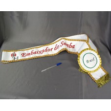 FAIXA COMEMORATIVA COM TÍTULO DE 'EMBAIXADOR DO SAMBA'. POSSUI LATERAIS EM VIÉS DOURADO; EXTREMIDADES COM FRANJAS NA MESMA COR; E, NA PARTE FRONTAL, BORDADO COM A INSCRIÇÃO 'UESP / SAMBA É CULTURA / EMBAIXADOR DO SAMBA'. NA EXTREMIDADE FRONTAL, ROSETA COM O NOME 'BRASIL' GRAVADO EM SEU INTERIOR.