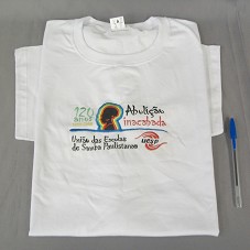 DUAS CAMISETAS IGUAIS (TAM M E G), EM MALHA BRANCA, DE MANGA CURTA. NA FRENTE, BORDADO COLORIDO, COM DESENHO DO PERFIL DE UMA MULHER NEGRA E A INSCRIÇÃO '120 ANOS 1888-2008 / ABOLIÇÃO INACABADA / UNIÃO DAS ESCOLAS DE SAMBA PAULISTA / UESP'.