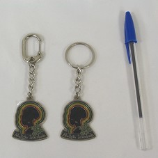DOIS CHAVEIROS EM METAL PRATEADO (10 E 11 CM), POSSUINDO COMO PINGENTE O PERFIL DE UMA MULHER NEGRA COM A INSCRIÇÃO '120 ANOS / ABOLIÇÃO INACABADA'. EM UM DELES, UM MOSQUETÃO.
