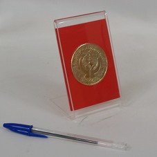 MEDALHA (50MM) EM METAL DOURADO. NO ANVERSO, FIGURA DE DUAS MÃOS SEGURANDO O SÍMBOLO DA MEDICINA, O SÍMBOLO DE ASCLÉPIO (REPRESENTADO POR UM BASTÃO TOSCO COM UMA SERPENTE EM VOLTA). AO REDOR DO DESENHO, EM ALTO RELEVO, A GRAVAÇÃO 'ESCUELA LATINOAMERICANA DE MEDICINA / CUBA'. ACONDICIONADA EM REDOMA DE ACRÍLICO COM BASE EM MESMO MATERIAL.