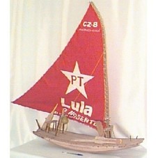 MINIATURA DE JANGADA (21X73X95 CM) CONFECCIONADA EM MADEIRA, COM VELA EM TECIDO VERMELHO, TENDO OS DIZERES 'CZ-8 FORTALEZA-CEARÁ PT LULA O NOSSO PRESIDENTE'. JANGADA CONTENDO OS REMOS, CORDAS E UMA CABAÇA EM AMARELO ESVERDEADO.