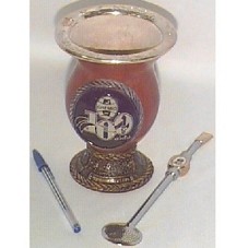 CUIA DE CHIMARRÃO (16X12 CM), COM EMBLEMA DO TIME DE FUTEBOL GRÊMIO DENTRO DE UM CÍRCULO AZUL COM A INSCRIÇÃO '100 ANOS', NA PARTE FRONTAL. O PÉ DA CUIA FOI ESCULPIDO, MOSTRANDO DESENHOS DE TRANÇAS NAS EXTREMIDADES E DE CARRO DE BOI , CAVALO E PESSOAS NO MEIO. COM AS INSCRIÇÕES 'MEU POVO', 'MEU CHIMARRÃO', 'MINHAS TRADIÇÕES'. ACABAMENTO EM METAL PRATEADO E TRABALHADO NA BORDA SUPERIOR, COM DETALHE EM DOURADO MOSTRANDO UMA CUIA ONDE ESTÁ ESCRITO 'LULA'. ACOMPANHA BOMBA EM METAL PRATEADO, COM DETALHE EM DOURADO NO CENTRO, COM O EMBLEMA DO 'GRÊMIO' E '100 ANOS', E BICO DOURADO.