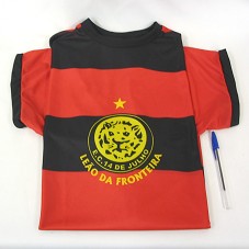 CAMISA DE FUTEBOL (TAM GG) DO TIME 'ESPORTE CLUBE 14 DE JULHO', COM LISTRAS HORIZONTAIS NAS CORES PRETA E VERMELHA. NA FRENTE, EM AMARELO, BRASÃO DO TIME, COM A INSCRIÇÃO 'LEÃO DA FRONTEIRA'.