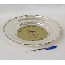 BAIXELA CIRCULAR (29,5 CM), CONFECCIONADA EM PRATA. NA PARTE INTERNA, PLACA CIRCULAR EM METAL DOURADO, CONTENDO A INSCRIÇÃO 'REPÚBLICA DE GUINEA ECUATORIAL / UNIPAD / PAZ / JUSTICIA / 12-OCTUBRE-1968', COM BRASÃO DA REPÚBLICA. ACONDICIONADO EM ESTOJO FORRADO E NAPA VERMELHA.