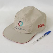 BONÉ EM TECIDO BEGE. NA FRENTE, ESTAMPA COM DESENHO DE CÍRCULO COLORIDO E A INSCRIÇÃO 'COLAPNEUS'. NAS LATERAIS, LOGOMARCA DA 'PIRELLI'.