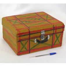 MALETA(14,5X27X22,5 CM) CONFECCIONADA EM MADEIRA, REVESTIDA COM PAPEL PINTADO EM MARROM, COM DESENHO QUADRICULADO NAS CORES VERMELHO, PRETO E VERDE. POSSUI ALÇA CURTA E FECHADURA PARA CADEADO.