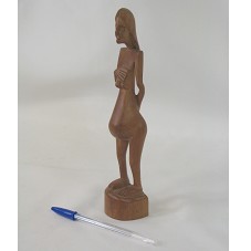 ESCULTURA (24 CM) CONFECCIONADA EM PEÇA ÚNICA DE MADEIRA, REPRESENTANDO UMA MULHER GRÁVIDA, NUA, COM UMA DAS MÃOS SOBRE OS SEIOS. NA PARTE INFERIOR DA BASE, A INSCRIÇÃO 'PS'.