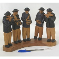ESCULTURA (18X25X7 CM) CONFECCIONADA EM MADEIRA, REPRESENTANDO UMA BANDA MUSICAL COMPOSTA POR CINCO HOMENS, CADA UM TOCANDO UM INSTRUMENTO DIFERENTE. TODOS VESTIDOS COM CAMISA E BONÉ PRETOS. NA PARTE INFERIOR DA BASE, A INSCRIÇÃO 'LUC'. ENCAIXADOS EM BASE DE MADEIRA.