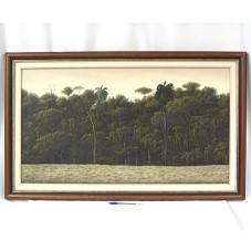 QUADRO (63X103 CM) COM MOLDURA EM MADEIRA ESCURA, FRISO DOURADO E PASSE-PARTOUT BEGE COM FRISO NA MESMA COR. EMOLDURA PINTURA (49X89 CM) SOBRE TELA, EM TONS DE VERDE, MARROM E BEGE. RETRATA UM BOSQUE, TENDO À FRENTE UM CAMPO DE VEGETAÇÃO BAIXA. NO CANTO INFERIOR DIREITO, ASSINATURA DO ARTISTA 'DAUSO 11/05'.