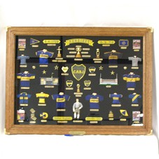 QUADRO COM MOLDURA (64X87,5 CM) EM MADEIRA CLARA, CANTONEIRAS EM METAL DOURADO E TAMPO DE VIDRO. NA PARTE INFERIOR DA MOLDURA, PLACA EM BRONZE COM A INSCRIÇÃO 'AL AMIGO LULA - MAURICIO MACRI / 22-II-2008'. EMOLDURA MINIATURAS DE UNIFORMES DO TIME DE FUTEBOL 'CLUBE ATLÉTICO BOCA JÚNIOR / CABJ', TAÇAS, CAPAS DE REVISTAS, BRASÕES, ETC. ATRÁS, COLADO, CERTIFICADO DE AUTENTICIDADE DA PEÇA.