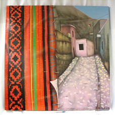PINTURA (130X130 CM) SOBRE TELA EM TONS DE VERMELHO, MARROM, ROSA E AZUL. RETRATA, EM PRIMEIRO PLANO, UMA TAPEÇARIA QUE SE ABRE PARA UMA RUA COM PEQUENAS CASAS. NA PARTE INFERIOR DIREITA, A INSCRIÇÃO 'JAN SALVADOR ... ' E ASSINATURA DO ARTISTA 'F DEFELIPE'.