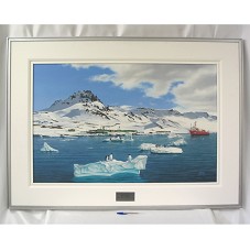 QUADRO (93X128 CM) COM MOLDURA EM MADEIRA PINTADA DE PRATA, PASSE-PARTOUT BRANCO COM FRISO. EMOLDURA PINTURA (65X100 CM) SOBRE TELA RETRATANDO PAISAGEM DA ANTÁRTICA, DA 'ESTAÇÃO ANTÁRTICA COMANDANTE FERRAZ'. EM PRIMEIRO PLANO, BLOCO DE GELO COM PINGUINS. NO CANTO DIREITO, UM NAVIO VERMELHO. PREDOMINA TONS DE AZUL E BRANCO. NO CANTO INFERIOR DIREITO, ASSINATURA DO ARTISTA 'LEONIDAS CALMON'. NA PARTE INFERIOR CENTRAL, PLACA METÁLICA COM A INSCRIÇÃO 'AO EXCELENTÍSSIMO SENHOR PRESIDENTE DA REPÚBLICA LUIZ INÁCIO LULA DA SILVA / A HOMENAGEM DA MARINHA DO BRASIL POR OCASIÃO DA SUA VISTA À ESTAÇÃO ANTÁRTICA COMANDANTE FERRAZ / FEVEREIRO 2008'. ATRÁS, DADOS DA TELA, NOME E ASSINATURA DO ARTISTA.