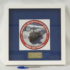 FOTOGRAFIA (15X15 CM) IMPRESSA E COLADA SOBRE AZULEJO. RETRATA O NAVIO OCEANOGRÁFICO 'ARY RONGEL' NA ANTÁRTICA. POSSUI A INSCRIÇÃO 'OPERAÇÃO ANTÁRTICA XXVI 2007/2008 / NAPOC ARY RONGEL'. ABAIXO, PLACA METÁLICA COM A GRAVAÇÃO 'AO EXMO. SR. PRES. DA REPÚBLICA LUIZ INÁCIO LULA DA SILVA / POR SUA VISITA AO NAPOC ARY RONGEL / FEV 2008'. POSSUI MOLDURA (30X30 CM) TIPO CAIXA, EM MADEIRA PINTADA DE BRANCA, COM TAMPO DE VIDRO. FUNDO EM AZUL MARINHO.