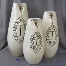 CONJUNTO DE TRÊS VASOS DECORATIVOS/ORNAMENTAIS, CONFECCIONADOS EM CERÂMICA, EM TAMANHOS DIFERENTES (45,5 CM, 51 CM E 60CM). PINTADOS EXTERNAMENTE EM TONS DE BEGE, COM DESENHO ICONOGRÁFICO GRAVADO NA PARTE FRONTAL. GARGALO ARREMATADO COM CORDA DE SISAL TRANÇADA E PEÇA CERÂMICA. DENTRO DE UM DOS VASOS, CARTÃO DO FABRICANTE.