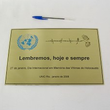 PLACA METÁLICA (20X30 CM) NA COR DOURADA. POSSUI A INSCRIÇÃO 'LEMBREMOS, HOJE E SEMPRE / 27 DE JANEIRO, DIA INTERNACIONAL EM MEMÓRIA DAS VÍTIMAS DO HOLOCAUSTO / UNIC-RIO, JANEIRO DE 2008'. NA PARTE SUPERIOR DA PLACA, SÍMBOLO DA ONU E DESENHO DE UM ARAME TERMINANDO EM FLOR. ACONDICIONADA EM ESTOJO FORRADA DE LYCRA AZUL.