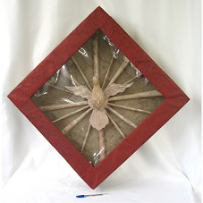 ESCULTURA (60X60X9 CM) CONFECCIONADA EM MADEIRA CLARA. FIGURA DE UMA POMBA COM AS ASAS ABERTAS, REPRESENTANDO O ESPÍRITO SANTO, FIXADA EM CÍRCULO DE ONDE SAEM RAIOS DE MADEIRA. ACONDICIONADA EM CAIXA (55X56X11,5 CM) FECHADA DE PAPELÃO MICROONDULADO, COM TAMPO DE ACETATO E TRABALHO EM PAPEL ARTESANAL. ATRÁS DA CAIXA, FOLHETO COM DADOS DA PEÇA E DO AUTOR E BREVE HISTÓRICO.